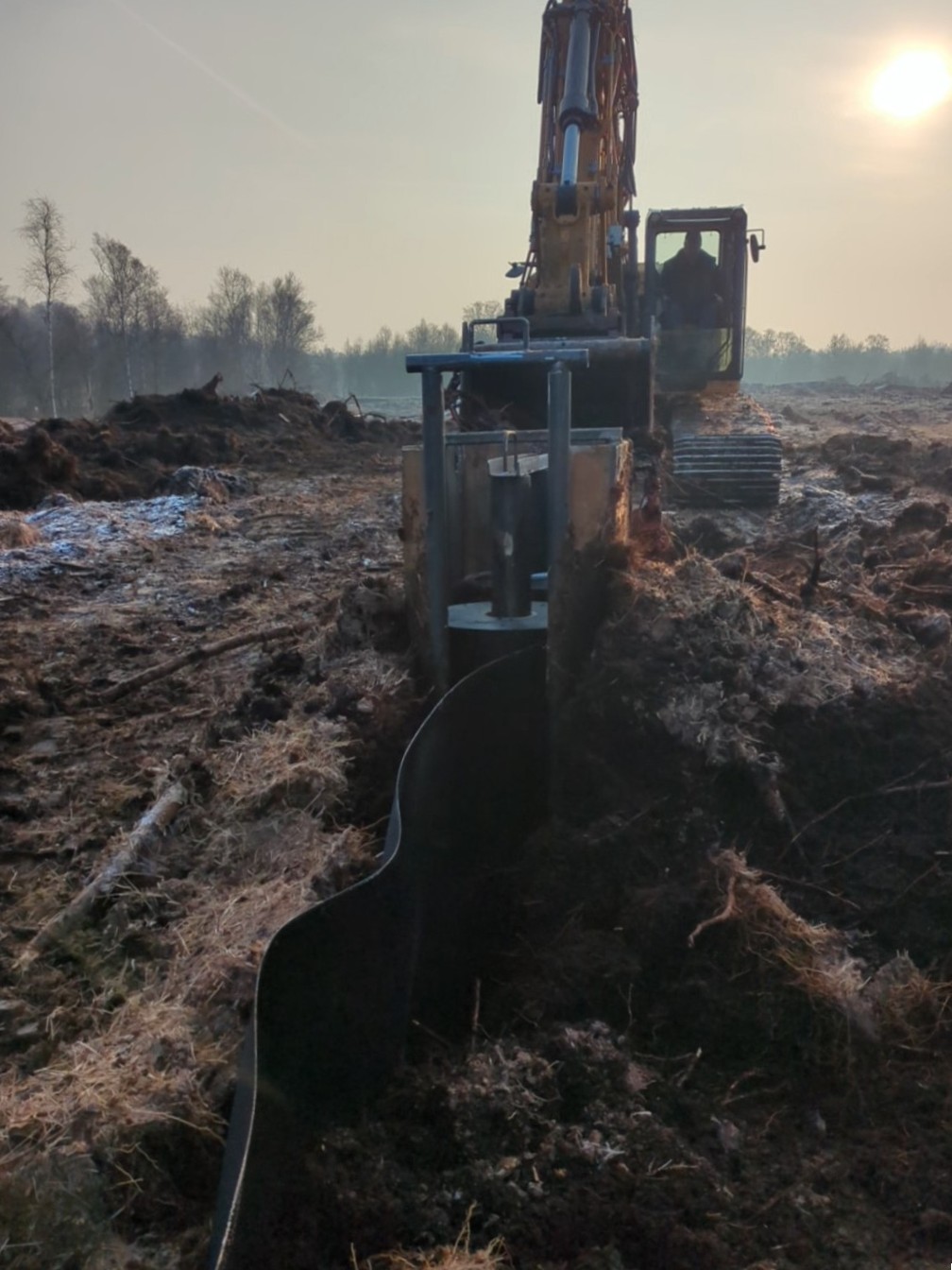 Dichtbahnpflug zieht Folie in Boden