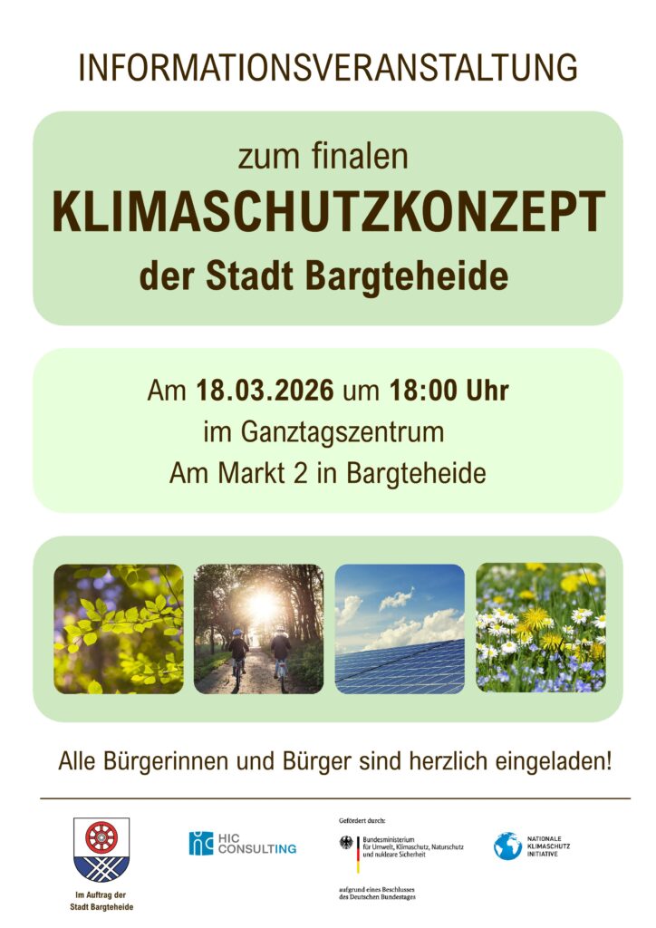 Die Stadtvertretung wird sich ihrer Sitzung am 12. März 2026 mit dem Konzeptentwurf befassen. Die Entwurffassung des Integrierten Vorreiterkonzeptes (Klimaschutzkonzept) der Stadt Bargteheide wird gemeinsam mit der HIC Consulting GmbH am 18. März 2026 um 18:00 Uhr im Ganztagszentrum (Am Markt 2) präsentiert.