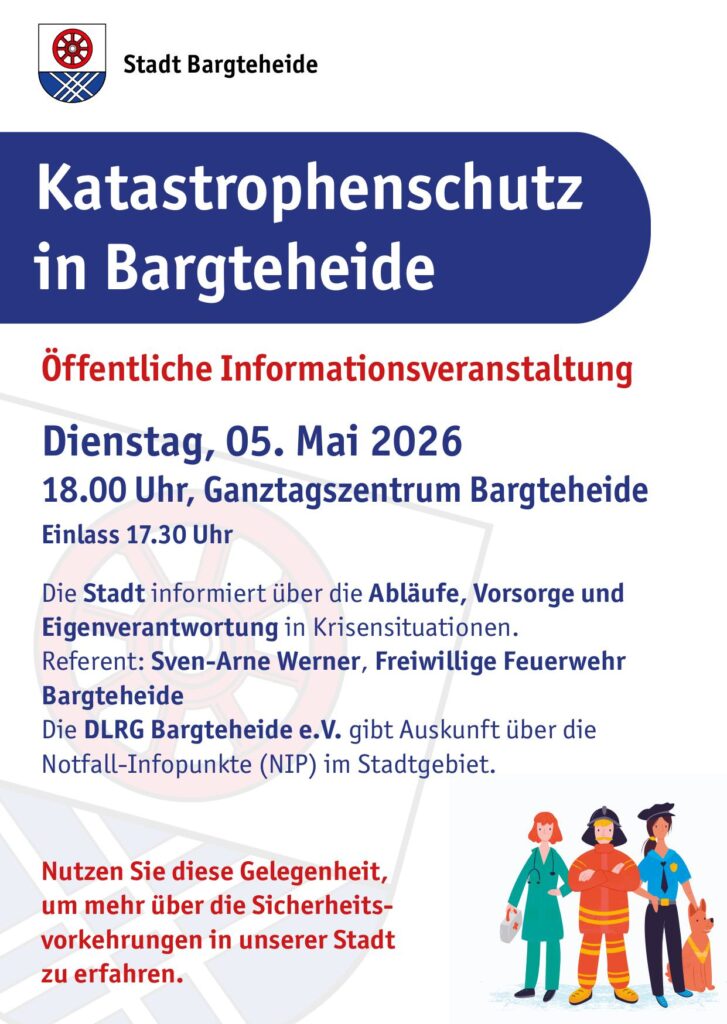 Die Stadtverwaltung Bargteheide und die Freiwillige Feuerwehr Bargteheide laden daher alle Bürgerinnen und Bürger zur öffentlichen Veranstaltung zum Thema Katastrophenschutz ein.