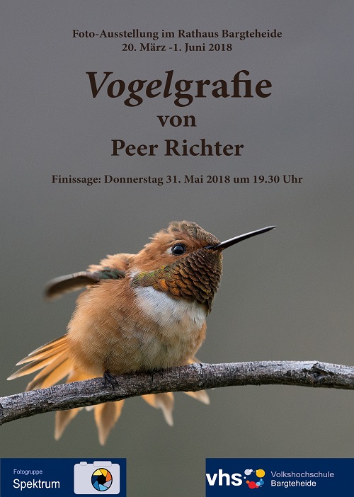 Noch bis zum 01.06.2018 zeigt Peer Richter, ebenfalls Mitglied der VHS-Fotogruppe „Spektrum“, im Rathaus der Stadt Bargteheide Fotoarbeiten zum Thema „Vogelgrafie“. Peer Richter ist Fördermitglied der Gesellschaft Deutscher Tierfotografen. Er fotografiert seit 40 Jahren; seit 10 Jahren mit dem Schwerpunkt auf die Natur- und Vogelfotografie. Seine besondere Vorliebe gilt den Kranichen und Eulen. Aber auch die Stockente auf dem heimischen Teich findet sich in seinen Arbeiten. Seine Ausstellung im Rathaus zeigt einen Querschnitt seiner Arbeiten während der letzten 6 Jahre. Die Bilder entstanden überwiegend auf eigens dafür organisierten Fotoreisen, im Urlaub mit der Familie und in der heimischen Umgebung. Zur Finissage der Ausstellung am Donnerstag, den 31.05.2018 um 19:30 Uhr laden wir um herzlich in das Rathaus der Stadt Bargteheide ein.