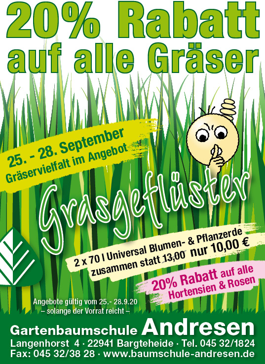 Auch der winterliche Rauhreif erzeugt fantastische Gartenbilder. Gerne beraten wir Sie über Standorte – von Sumpf bis Prärie – und Winterfestigkeit der Gräser. „Natürlich können Sie unser Gärtnerteam auch zu allen wichtigen Herbstaktivitäten, wie z.B. Blumenzwiebeln, Winterschutz, Bodenpflege und Herbstpflanzungen befragen“ ergänzt Jörn Andresen. „Gern erklären wir Ihnen auch die Vorzüge der Herbstpflanzung und zeigen Ihnen die Möglichkeiten auf, wie Sie schon jetzt etwas für einen tief grünen Rasen im nächsten Jahr tun können.“ Alle Angebote – 20 % auf alle Gräser, Rosen und Hortensien – sind nur gültig während der Grasgeflüstertage vom 25. – 28. September 2020, so lange der Vorrat reicht.