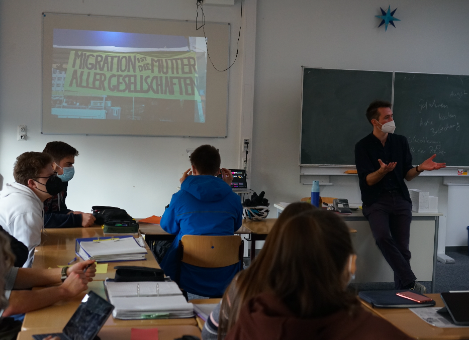 Mit Hilfe des Referenten Lee Hielscher (Open School 21), der ethnographisch u. a. zu Migration, soziale Rechte und strukturelle Ausbeutung in der EU arbeitet, konnten die Schülerinnen und Schüler diese und weitere grundsätzliche Fragen zum Thema Migration, Flucht und globale Menschenrechte klären und in den Austausch kommen.