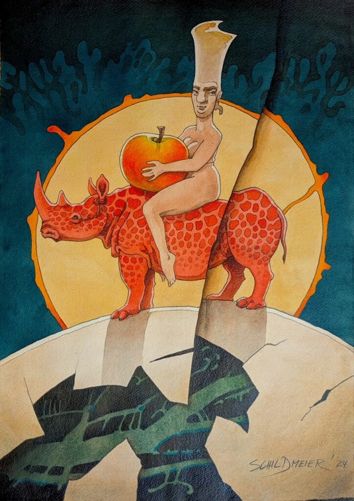 13 Stellwerker zeigen an diesen Tagen, was sie zu dem selbst gestellten Thema erarbeitet haben. Uwe Schildmeier lässt in seinem Werk eine reife Fortuna über eine zerbrechliche Eierschalen-Brücke reiten und nennt das Ganze „Auf dem roten Rhinozeros“. Rena Eckardt verschafft ihrem gemalten Bild mit dem Titel „Bühnenpause“ eine materielle Dimension, sehr direkt und begreiflich.