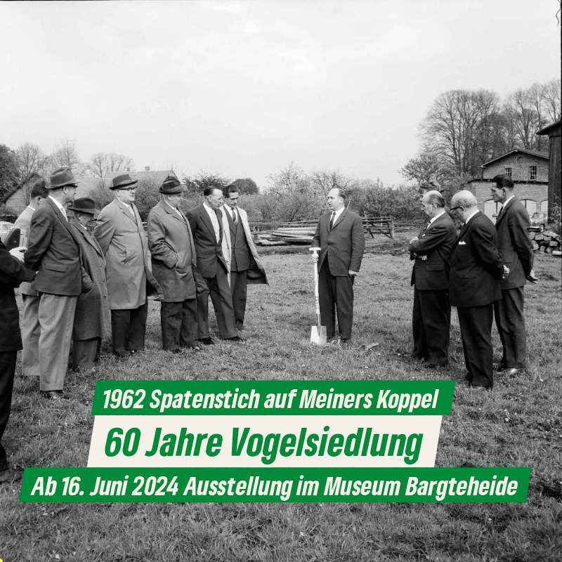 Auf der Hauskoppel von Bauer Henry Meiners zwischen Alter Landstraße und Jersbeker Straße entsteht eine Siedlung mit 165 Reihenhäusern. Erster Spatenstich am 15. Mai 1962: Bürgermeister Enno Wilkens mit Spaten (Mitte): im Beisein von Bürgervorsteher Hans-Heinrich Gaycken, Werner Böcker von der Firma Freese und Co., Leiter der Sonderschule Johannes Grünwald, Gemeindevertretern, darunter Erwin Gülde, Rudolf Möller, Rudolf Stahmer. Hinten rechts Scheune, Hofgebäude. Linke Gruppe v.l.n.r.: N.N. [verdeckt], N.N., Rudolf Stahmer, N.N., Johannes Grünwald, N.N., Erwin Gülde. Foto Raimund Marfels, Kreisarchiv Stormarn.