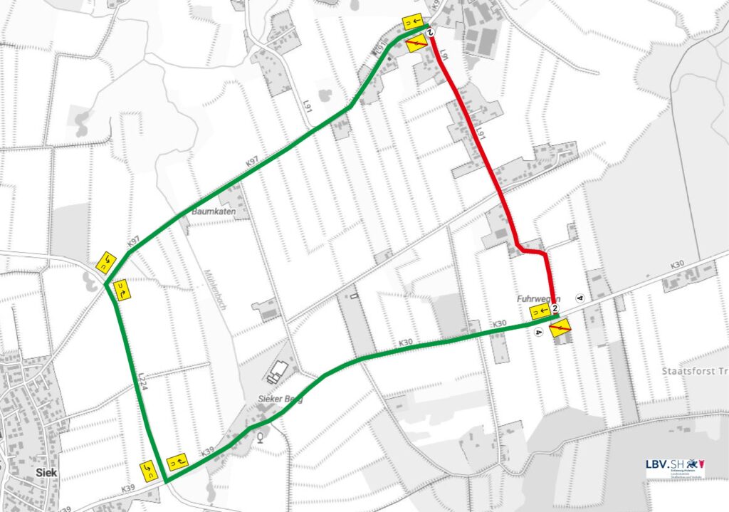 Die ausgeschilderte Umleitung hierfür führt von Fuhrwegen über Sieker Berg (K 30/K 39) bis zum Kreisverkehr, die L 224 Richtung Hoisdorf und den Hoisdorfer Weg (K 97) zur L 91 bei Hoisdorf und umgekehrt. Die Verkehrsführung wurde mit der Polizei, der Verkehrsbehörde, dem Kreis, dem Amt und den Busbetrieben abgestimmt. Der LBV.SH bittet, sich auf die weiteren Arbeiten einzustellen, den ausgeschilderten Umleitungen zu folgen sowie um rücksichtsvolles Verhalten zum Schutz der Menschen auf der Baustelle.
