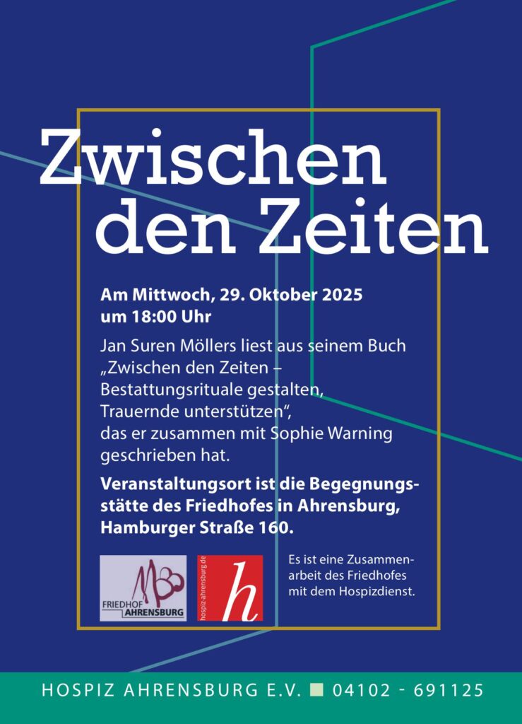 Am 29.10.2025 um 18:00 Uhr liest Jan Surem Möllers aus seinem Buch „Zwischen den Zeiten“, das er zusammen mit Sophie Warning geschrieben hat. Jan Suren Möllers ist Kulturanthropologe, Bestatter und Trauerbegleiter. „Zwischen den Zeiten“ ist eine wertvolle Handreichung für die Zeit rund um den Tod und ist getragen von der Grundhaltung, den Sterbenden und seinen Zugehörigen ein selbstbestimmtes Abschiednehmen zu ermöglichen.