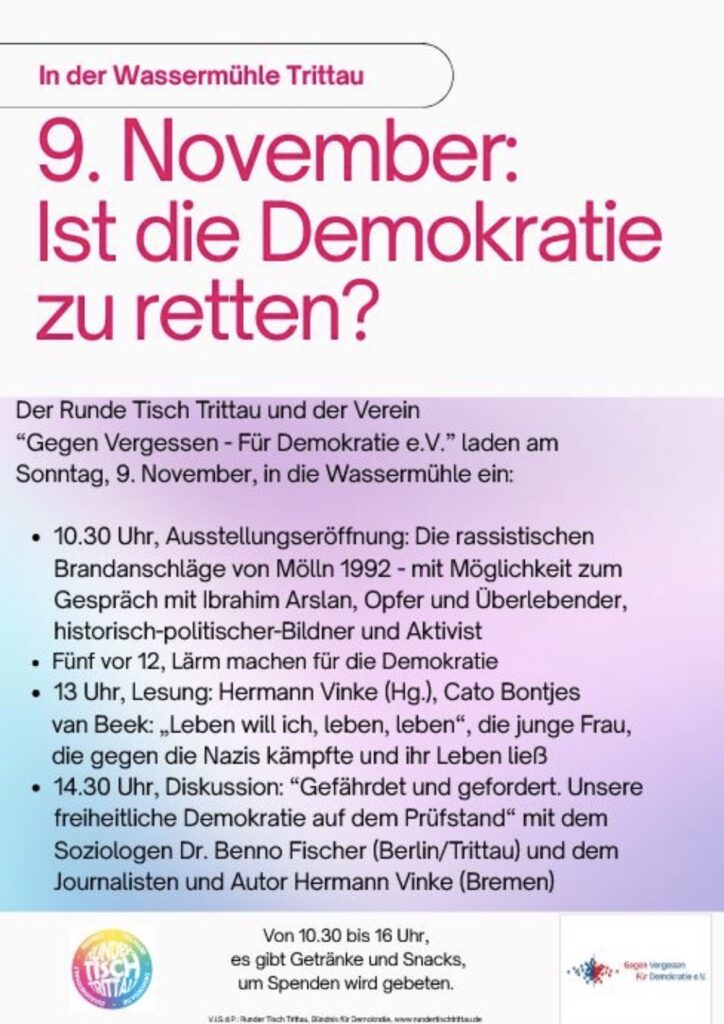 Trittau – Der 9. November ist ein besonderer historischer Tag in Deutschland: Unter anderem war 1918 die Novemberrevolution, 1923 der gescheiterte Hitlerputsch, 1938 die Reichspogromnacht und schließlich 1989 der Mauerfall. Es zeigt sich wie widersprüchlich die Ereignisse an diesem Tag jeweils sind. Der Runde Tisch Trittau und der Verein „Gegen Vergessen – Für Demokratie e.V.“ laden ein, sich mit diesen historischen Ereignissen zu beschäftigen. In der Trittauer Wassermühle geht ums Erinnern – und um die Zukunft der Demokratie.