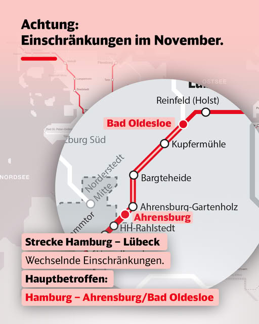 Im gesamten November kommt es auf der Strecke Hamburg – Lübeck zu wiederkehrenden Einschränkungen. Betroffen ist vor allem der Abschnitt Hamburg – Ahrensburg/Bad Oldesloe. Bitte informiert euch vor jeder Fahrt über eure Verbindungen.