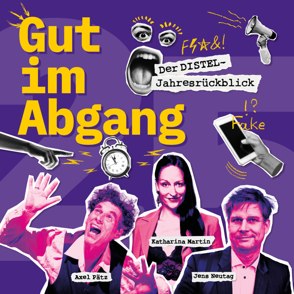 Seit Ende 2024 produziert das Hauptstadt-Kabarett DISTEL einen wiederkehrenden Jahresrückblick, bei dem die Themen des Jahres nochmals unter das Brennglas des Humors gelegt werden. In „Gut im Abgang!“ wird an Themen erinnert, die man zu Recht vergessen hat, aber auch alles gewürdigt, was in naher oder ferner Zukunft in den Geschichtsbüchern stehen wird. Es wird gelästert, getanzt und gesungen – nach allen Regeln der Kabarett-Kunst gibt man dem Jahr 2025 den Rest, wobei der wichtigste Grundsatz lautet: Langweilen verboten!