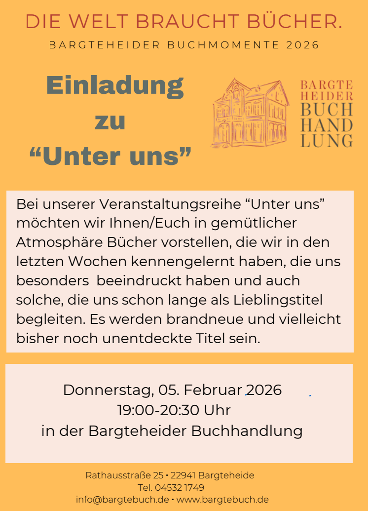 AktuellAllgemeinTermine „Unter uns“ Von mac - Jan. 12, 2026 0 Wir laden herzlich ein zum 1. Mal „Unter uns“ im neuen Jahr 2026! Donnerstag, 05. Februar 2026 19:00 – 20:30 Uhr Bargteheider Buchhandlung