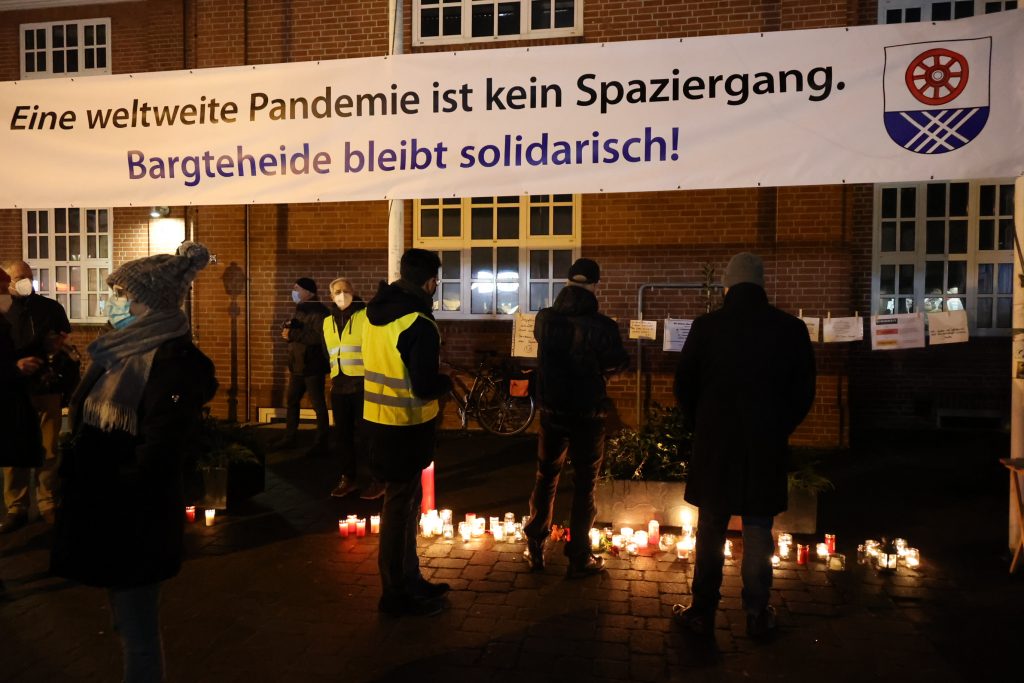 „Eine weltweite Pandemie ist kein Spaziergang – Bargteheide bleibt solidarisch“ hieß es auf einem Transparent vor dem Rathaus. Dieses Motto bezog sich auch auf die „Spaziergänger“, die seit einigen Wochen in der Stadt gegen die Maßnahmen zur Bekämpfung der Corona-Pandemie protestieren.